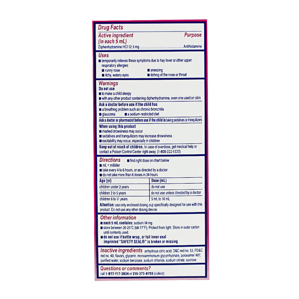 • Active Ingredient: Diphenhydramine HCl 12.5 mg per 5 mL (Antihistamine)