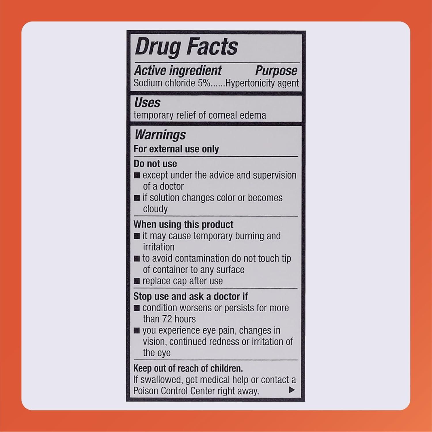 • Active: Sodium Chloride 5% – Hypertonicity agent for reducing corneal edema