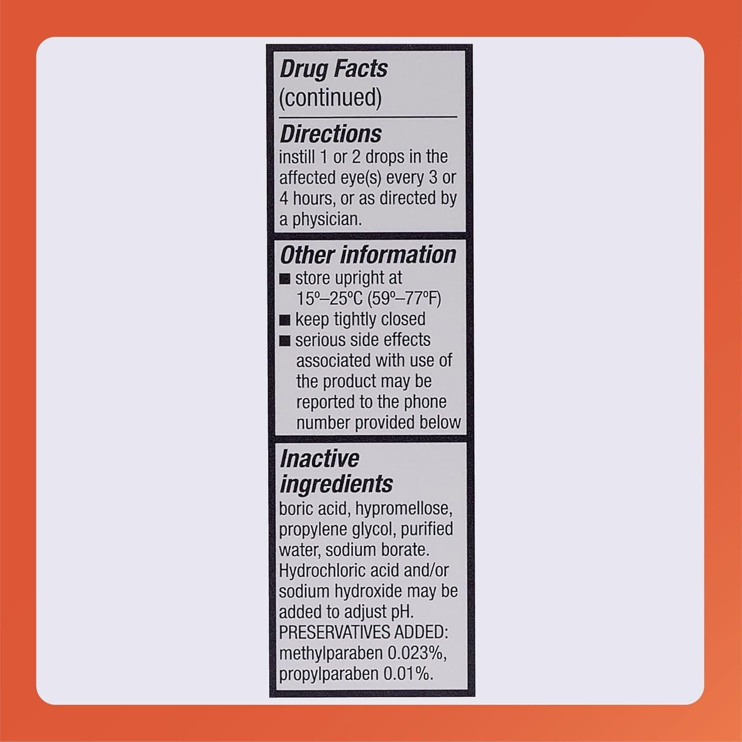 • Inactive: Boric Acid, Hypromellose, Propylene Glycol, Sodium Borate, Purified Water, Methylparaben (0.023%), Propylparaben (0.01%), Hydrochloric Acid and/or Sodium Hydroxide (to adjust pH)