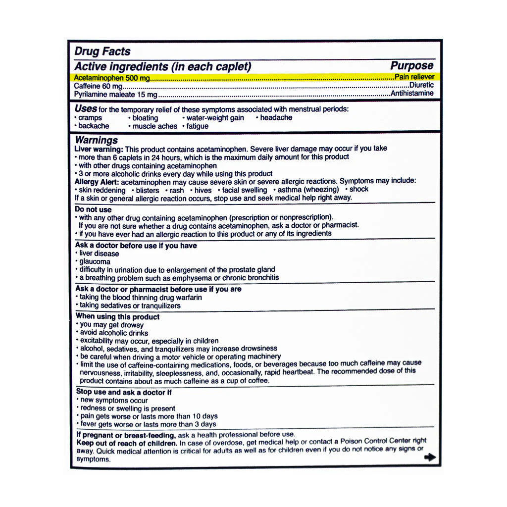Includes a combination of pain reliever, diuretic, and antihistamine