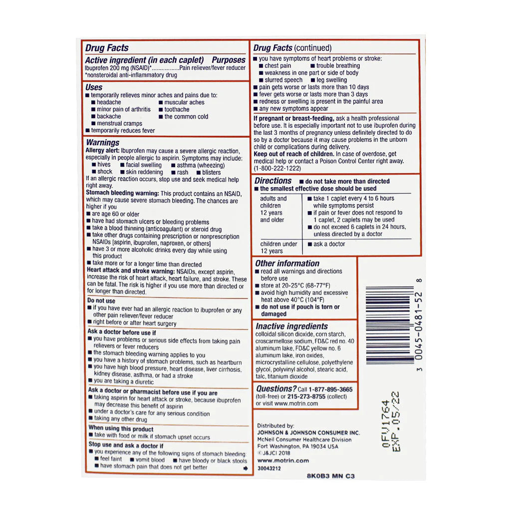 Motrin® Ibuprofen – 4 Tablets, Card of 4, Case of 36