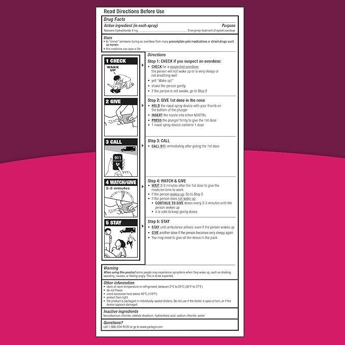 Padagis® Naloxone is the first FDA-approved over-the-counter generic version of NARCAN®, designed to reverse opioid overdoses quickly and effectively. Each carton contains two single-dose, needle-free nasal spray devices, offering life-saving support for individuals, families, schools, public health agencies, and workplace safety programs.