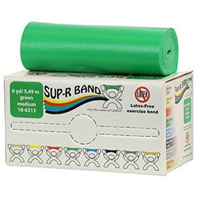 - Elastomer (TPE), SUP-R BAND mimics the performance of traditional latex bands without the risk of allergic reactions. Its 5-inch width and textured surface provide a comfortable grip and better control during use. Available in both 6-yard and 50-yard rolls, these bands are color-coded to match industry-standard resistance levels and come packaged in a convenient dispenser box for easy cutting and use. SUP-R BAND delivers consistent stretch resistance and a clean, powder-free experience—perfect for clinics, fitness centers, or home workouts.