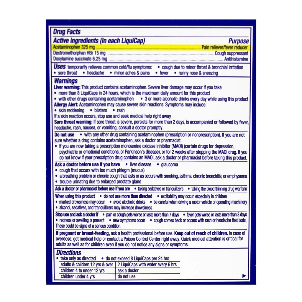 Relieves cough, sore throat, fever, nasal & sinus congestion, headache, and body aches