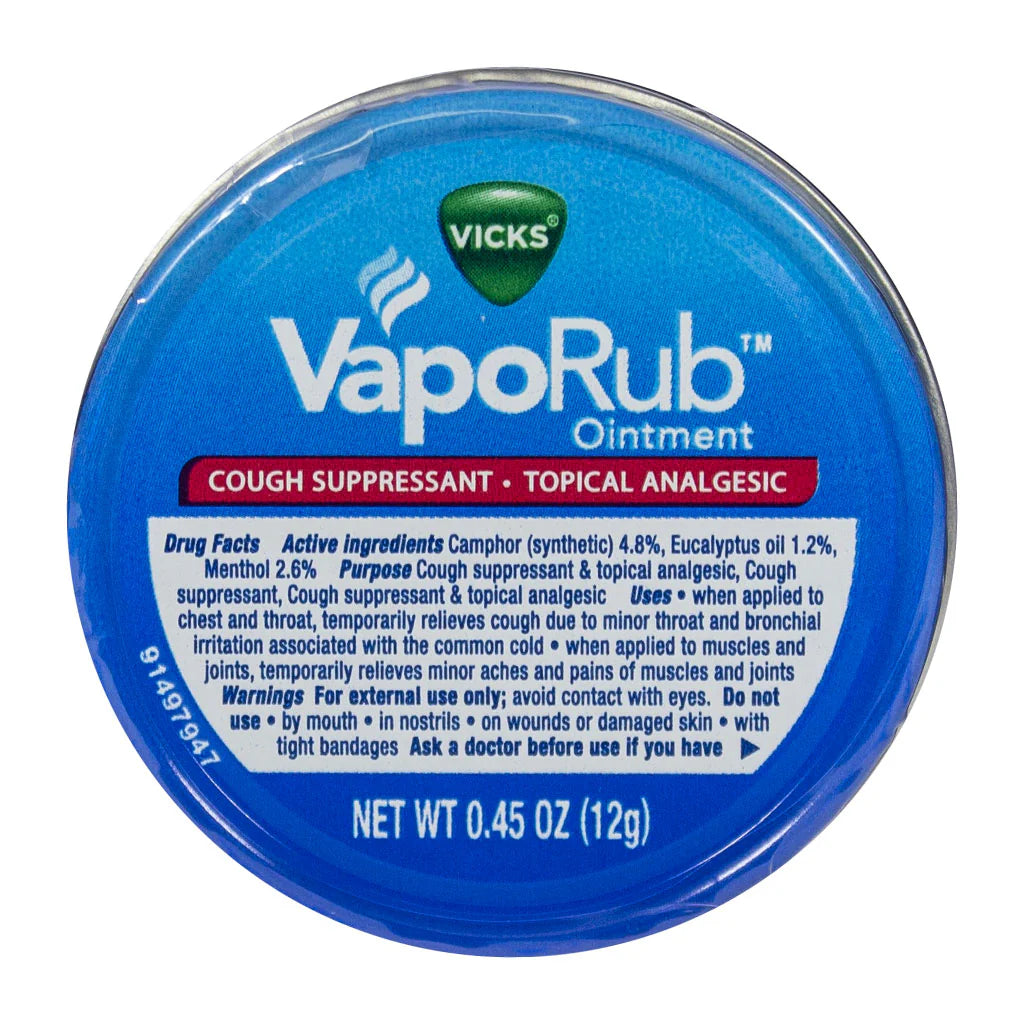 Vicks® VapoRub is a time-tested, medicated ointment that relieves cough and muscle aches associated with colds. With its soothing vapors of menthol, eucalyptus oil, and camphor, VapoRub works through topical application to the chest, throat, or back, delivering comforting relief that customers know and trust. The compact 0.45 oz tins are perfect for on-the-go use and vending machine placement. With 24 tins per box, this product is ideal for wellness vending machines, student health centers, workplace wellness programs, gyms, and airports.